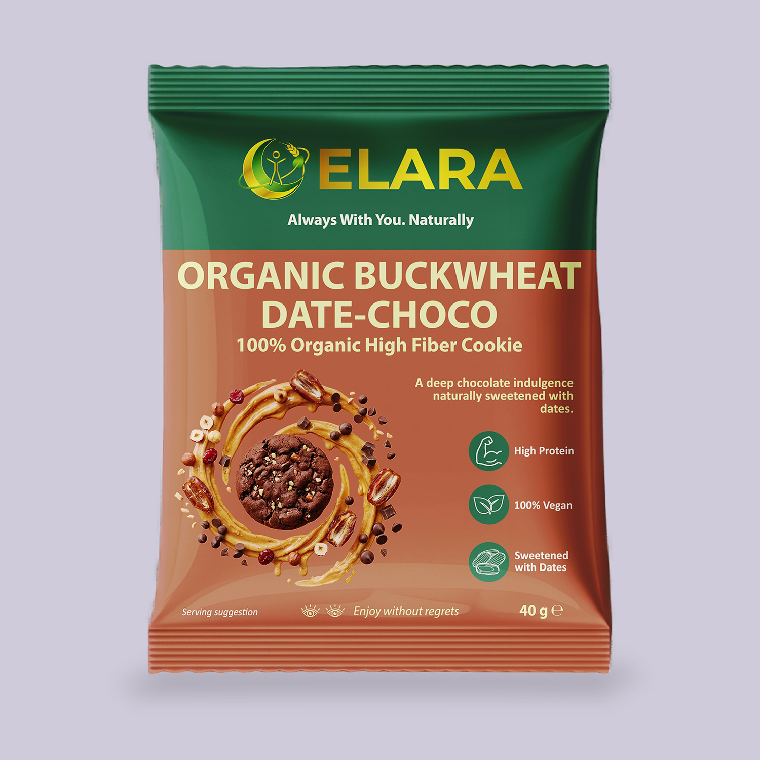 Głęboka czekoladowa przyjemność z absolutnie czystym składem! Usunęliśmy wszystkie słodziki i zostawiliśmy tylko naturalną, karmelową słodycz pasty daktylowej i purée jabłkowego. To podwójnie czekoladowe ciastko na bazie naturalnie bezglutenowej mąki gryczanej dostarczy Ci prawdziwej kulinarnej ekstazy.
