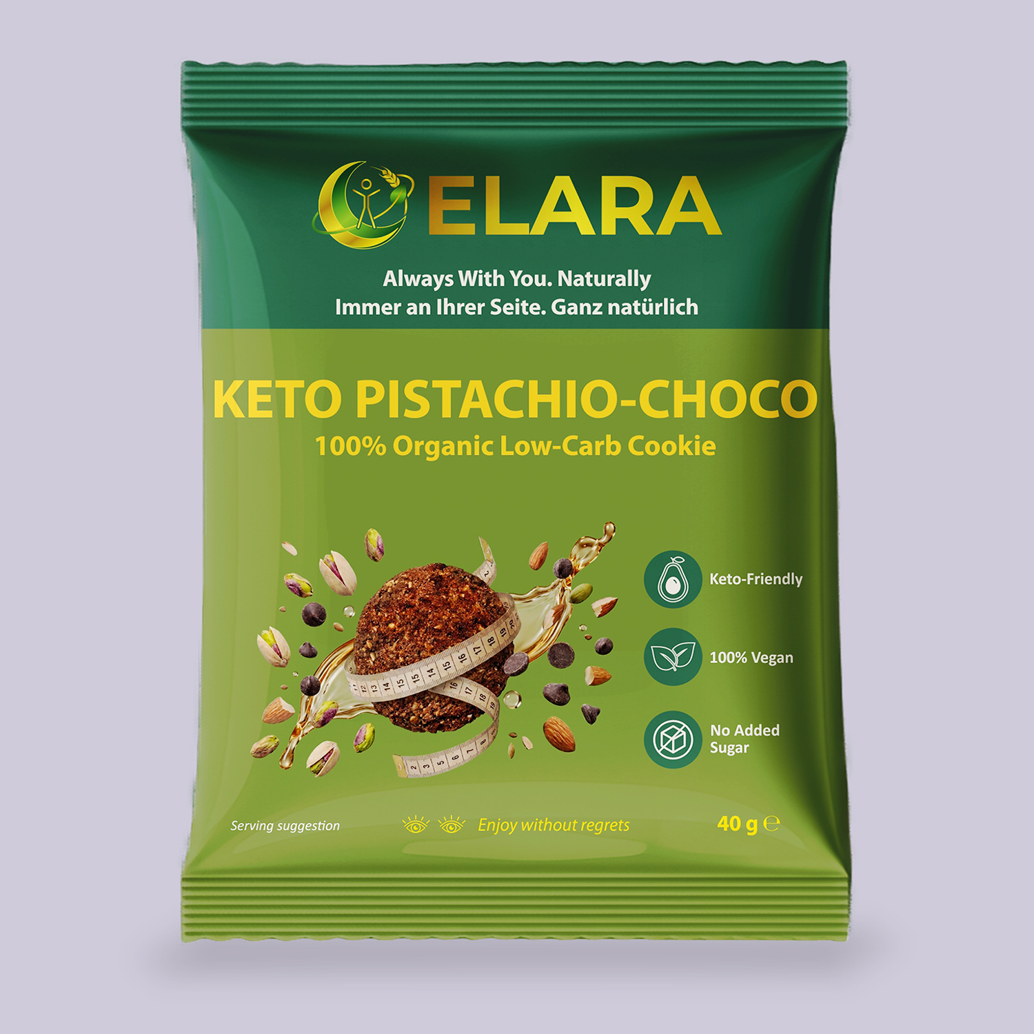 Składniki: Mąka migdałowa, substancja słodząca (erytrytol, ekstrakt z owoców mnicha), pistacje, olej kokosowy, kropelki czekolady bez cukru, mąka lniana, kakao w proszku, inulina.